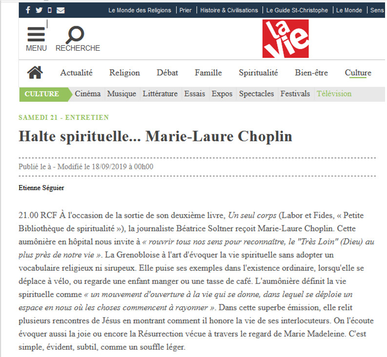 ••• « Halte Spirituelle » sur RCF, un entretien par jour (du lundi au vendredi à 15h et 20h45) puis l’intégrale – 55mn – le vendredi à 23h et le samedi à 21h. En direct la semaine du 4 février 2019 puis podcastable ici : https://rcf.fr/spiritualite/s-ouvrir-l-inconnu-de-dieu-15