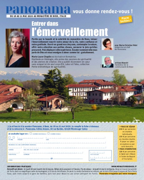 Attention ! La date indiquée sur le flyer ci-dessous n’est plus à jour. Cette session a été reportée du 23 au 26 mai 2022. Par ailleurs Enzo Bianchi a quitté la communauté de Bose.